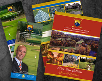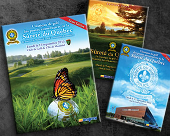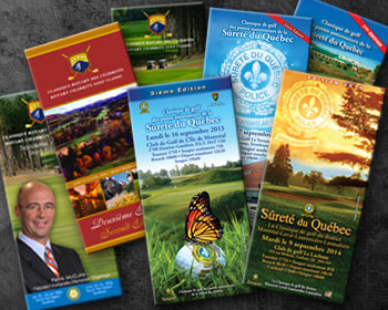 Conception graphique et mise en page de dépliants promotionnels de tournois de golf.