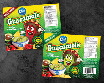 Image de marque: Conception graphique pour des étiquettes de produits de guacamole doux et épicés.
