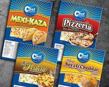 Image de marque: conception graphique et mise en page pour une variété de saveurs de fromage râpé.