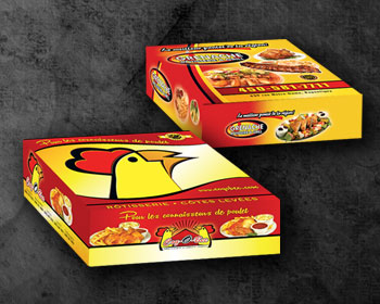Conception graphique et mise en page de deux boîtes à emporter de restaurant différentes.