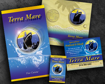 Conception graphique et mise en page des menus, cartes postales et cartes d'affaire pour le restaurant Terra Mare.